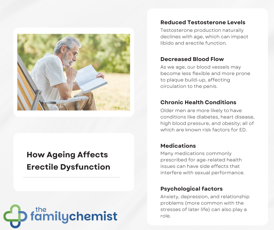 So, while ageing itself doesn’t directly cause ED, the physical and emotional changes associated with growing older can certainly increase the risk.