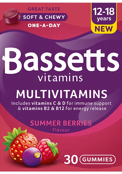 Bassets Multivitamin 12–18 Years Mixed Berries are soft, chewable multivitamin pastilles designed to support the everyday health of teenagers. With a tasty mixed berry flavour, they provide a blend of essential vitamins to help support growing bodies and busy lifestyles. Vitamins C and D help support the immune system, while Vitamins B2, B6 and B12 help reduce tiredness and support normal energy levels. They also contain Vitamin A to help support healthy vision and skin, and Vitamin D which helps the body absorb calcium to maintain healthy bones, muscles and teeth. Alongside these key nutrients, the formula includes several other important vitamins that help support overall wellbeing and the normal functioning of the body. Made with natural flavours and colours and no added sugar, these chewable pastilles are a simple and tasty way to help teenagers get essential vitamins as part of their daily routine.