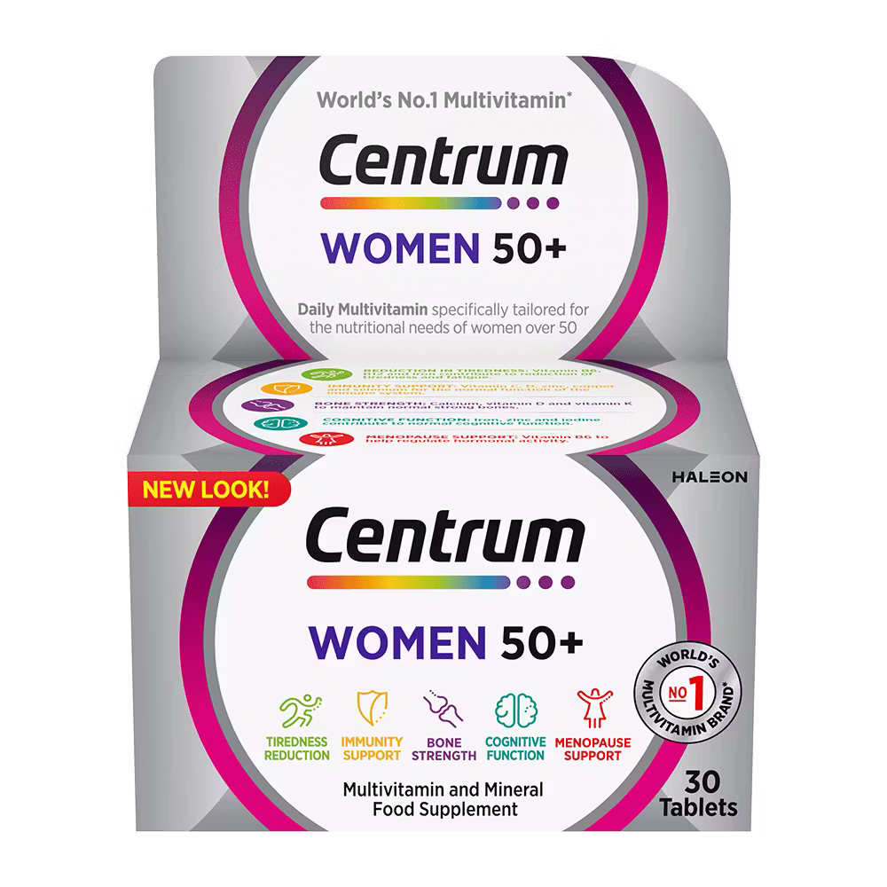 Centrum Women 50+ is a daily multivitamin specially designed to support the nutritional needs of women over 50. It provides a balanced blend of essential vitamins and minerals, including calcium, vitamin D, and B vitamins, to help maintain bone strength, support energy levels, and contribute to normal immune function. The formula also supports cognitive health and helps the body make the most of nutrients from food. These easy to swallow tablets are free from gluten, wheat, lactose, and nuts, making them suitable for everyday use.