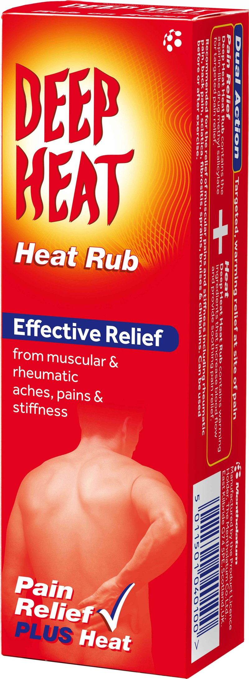 Deep Heat Heat Rub is a topical analgesic gel that provides warming relief for muscular aches, pains, and stiffness. It helps soothe everyday discomforts such as backache, rheumatic pain, sciatica, fibrositis, sprains, bruises, and minor sports injuries. The gel combines methyl salicylate for targeted pain relief with warming ingredients such as menthol, eucalyptus oil, and turpentine oil to increase blood flow and provide a soothing heating sensation.