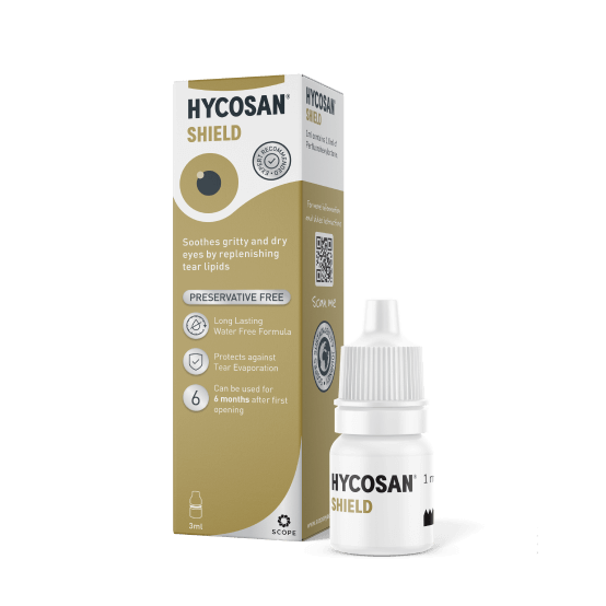 Hycosan Shield eye drops help relieve dry, gritty, or uncomfortable eyes. The formula contains perfluorohexyloctane, which helps replace the natural oils in the tear film and reduces tear evaporation. This helps keep the eyes comfortable and protects them from dryness. The water free formula spreads easily across the surface of the eye and provides quick relief from dry eye symptoms. By supporting the tear film’s lipid layer, the drops help maintain moisture and improve eye comfort. The preservative free drops are simple to use and provide many measured applications from each bottle. They are designed for people experiencing dry eye symptoms but should not be used while wearing contact lenses.