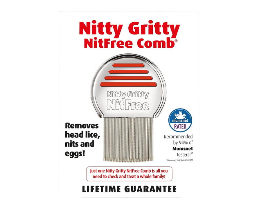 Nitty Gritty NitFree Comb is a specially designed head lice comb that helps remove lice and eggs effectively in one routine. Its fine, microgrooved metal teeth are made to catch even very small lice and firmly attached eggs, helping reduce the chance of repeat infestations. Unlike standard plastic combs, it is designed to work through the hair smoothly while providing thorough results without the need for chemical treatments. It can be used with conditioner to help glide through the hair more easily and comfortably. Suitable for the whole family, this durable comb can be reused and is ideal for both treatment and regular checks as part of a hair care routine.