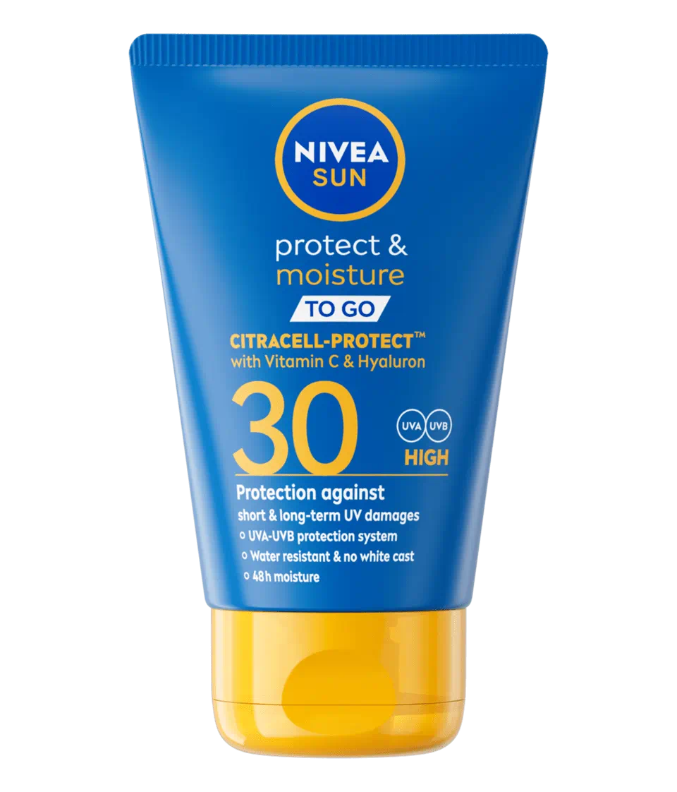Nivea Sun Protect & Moisture To Go SPF30 is a convenient travel size sun cream designed to help protect your skin while keeping it hydrated. The compact 50ml tube is perfect for carrying in your bag or pocket, making it easy to reapply protection throughout the day. It provides reliable protection against both UVA and UVB rays, helping to reduce the risk of sunburn and long term skin damage. The formula contains Vitamin C and Hyaluron, which help support the skin and protect it from everyday environmental stress while maintaining moisture. This lightweight sun cream absorbs quickly into the skin and spreads easily without leaving a greasy feel or white marks. It also helps keep skin moisturised for up to 48 hours, leaving it feeling soft and comfortable. The water resistant formula is suitable for everyday use and is made with consideration for the environment.