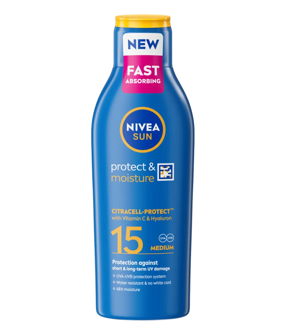 NIVEA Protect & Moisture SPF 15 Sun Cream helps protect your skin from everyday sun exposure while keeping it soft and hydrated. It provides UVA and UVB protection to help guard against sunburn and support healthy-looking skin. The formula contains Vitamin C and hyaluronic acid to help maintain moisture and keep skin feeling hydrated for up to 48 hours. The lightweight lotion absorbs quickly into the skin, spreads smoothly, and does not leave a white cast or sticky residue. It is also water resistant, making it suitable for daily use and light outdoor activities.