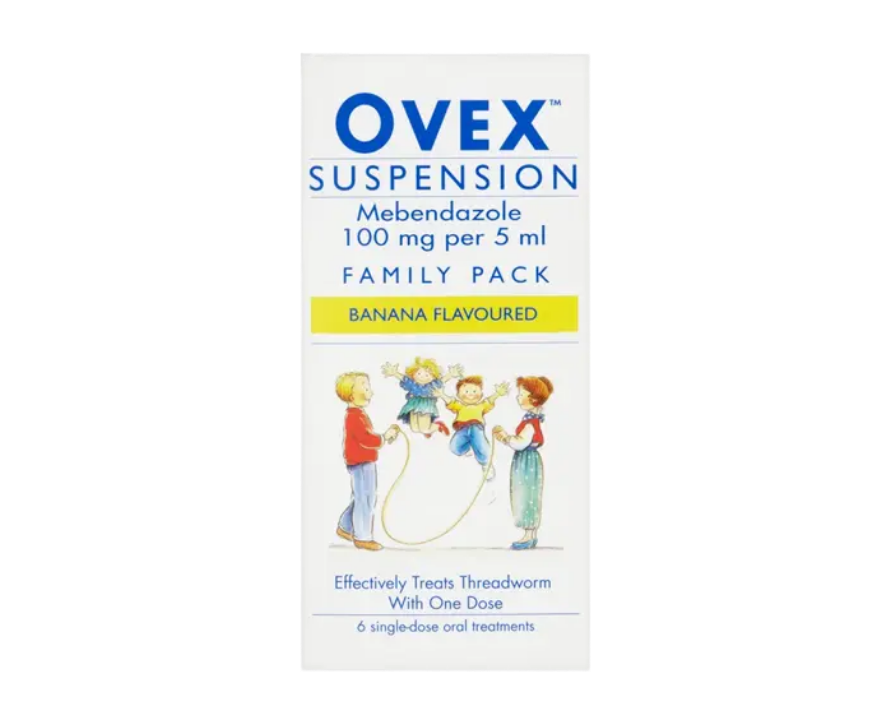 Ovex Suspension is an oral suspension designed to treat threadworm (pinworm) infections in the gut. It contains the active ingredient mebendazole, which belongs to a class of medicines called anthelmintics. Mebendazole stops threadworms from absorbing essential sugars they need to survive, causing them to lose energy, die off over a few days, and be passed out of the body in stools. It’s effective with a single dose per person, though a second dose is recommended after roughly two weeks to avoid re-infection.