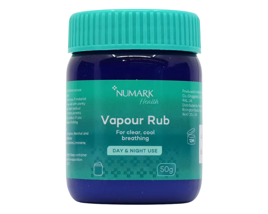 Vapour rub is a medicated ointment with camphor, eucalyptus oil, and menthol used to relieve cold symptoms like coughs, sore throats, and nasal congestion by creating a vapour that helps you breathe easier. It helps to calm coughs as well as act as a mild pain relief.
