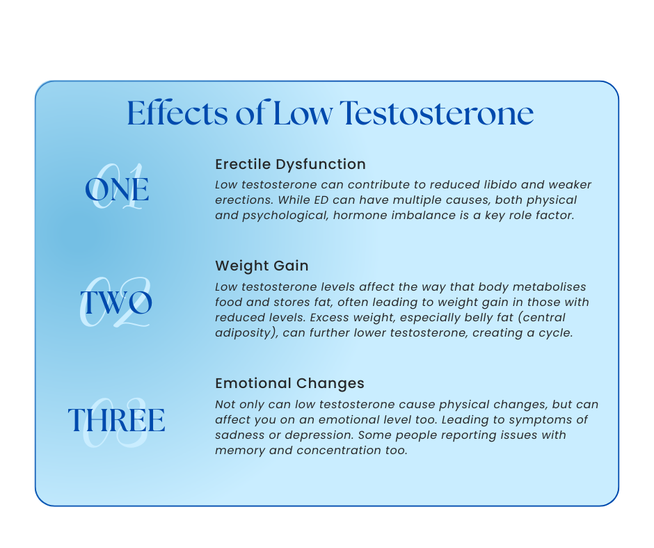 We’ve already touched on many of the effects low testosterone can have, but how does it actually cause effects such as hair loss, weight gain, or erectile dysfunction?