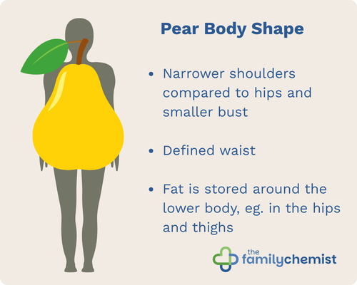 A pear-shaped body carries more weight around the hips, thighs, and lower body, appearing like a pear. This pattern of fat distribution carries less metabolic risk than abdominal fat, though there are still risks associated with carrying excess weight in the hips such as osteoporosis.